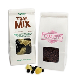 These Tin-Tie Bags have a Window and are perfect for ground coffee, whole coffee beans, tea, nuts, cookies and more! They feature a square bottom gusset which allows them to stand up on their own. They have a reusable tin-tie seal which will keep your product fresh. Our Tin Tie Bags have a polypropylene liner for grease resistance. Kraft Bags are 50# Natural Kraft. White Bags are 50# Stainless Claycoat. FDA compliant for direct food contact. Hot Stamping available.